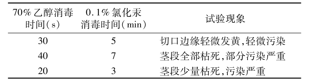 衝洗過的外植體放在已滅菌的濾紙上吸幹水分。以上3組處理材料分別接種在1/2MS培養基上,控製環境條件,培養溫度(25±2)℃,光強1 500~2 000 lx,光照12 h/d。在此條件下培養,觀察其生長狀況。