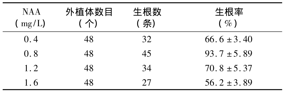 表3 不同濃度NAA對不定芽生根率及生根數目的影響