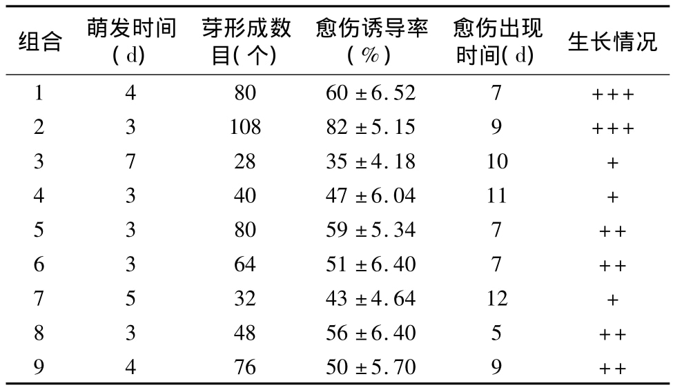 注:“+++”表示愈傷組織長勢很好,形成的愈傷組織數目、大小均比較理想;“++”表示長勢良好;“+”表示長勢一般,形成的愈傷組織數目較少,體積較小。